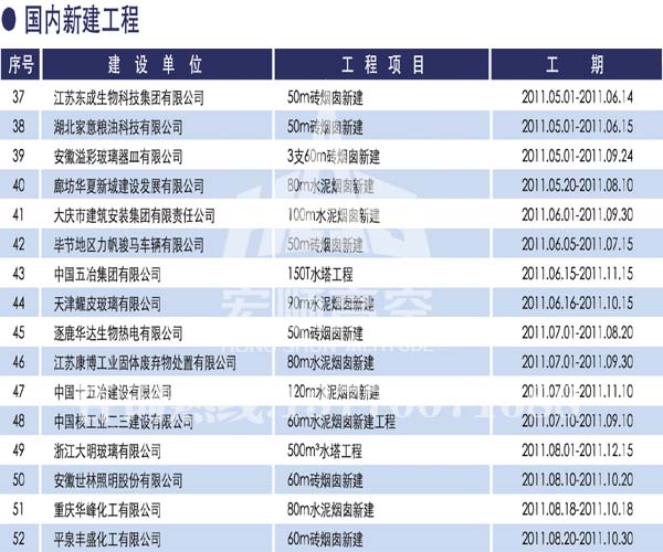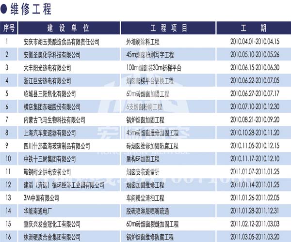 宏順建設(shè)工程有限公司是國家批準(zhǔn)成立的專業(yè)高空作業(yè)企業(yè):承攬過(國內(nèi).國外)煙囪新建、煙囪防腐、磚煙囪新建、煙囪改造、煙囪維修、煙囪脫硫防腐、煙囪拆除加高、煙囪滑膜等高空作業(yè)工程。具有“不搭腳手架 、 不需要停產(chǎn)”施工特點(diǎn)。
